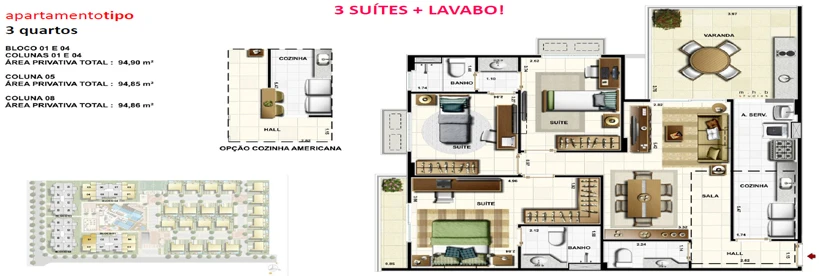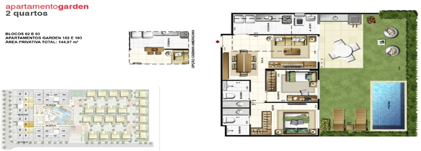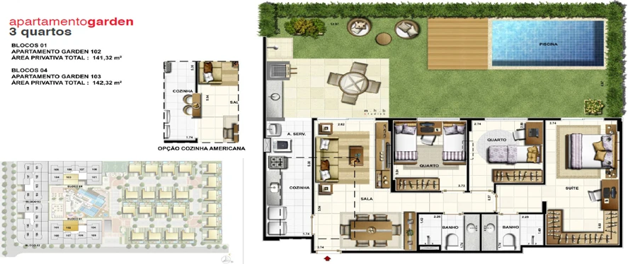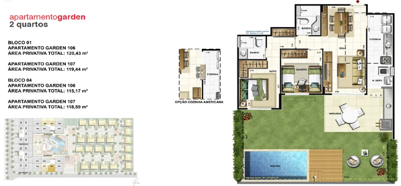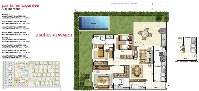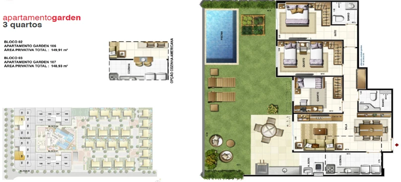 3 quartos com varanda térrea, piscina e espaço gourmet. Espaço ao ar livre com privacidade, acesso exclusivo e garagem privativa.
